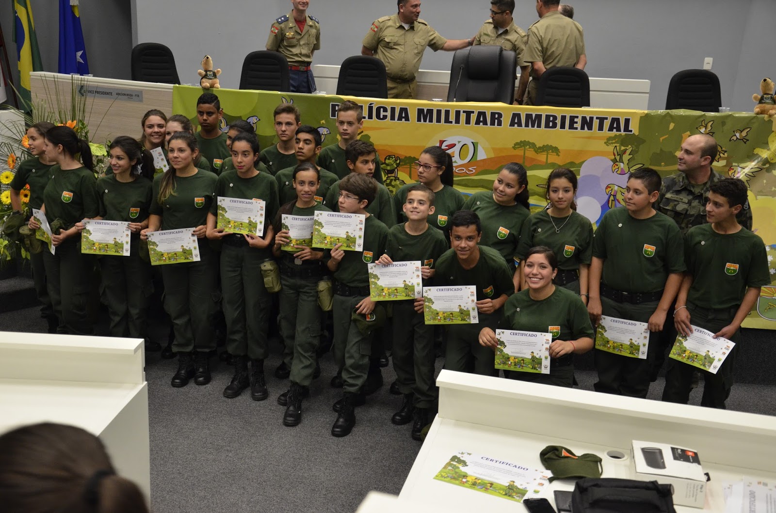 Lages ganhou 25 novos protetores ambientais. São alunos da rede de ensino pública e privada que completaram o curso do projeto Protetor Ambiental, desenvolvido pela 4° CIA de Polícia Militar Ambiental de Lages por meio do Grupo de Educação Ambiental e, que contou com a parceria da empresa Klabin, parceira do projeto há 11 anos. A formatura da 28° de protetores ocorreu na noite desta quarta-feira (16), no plenário da Câmara de Vereadores de Lages.